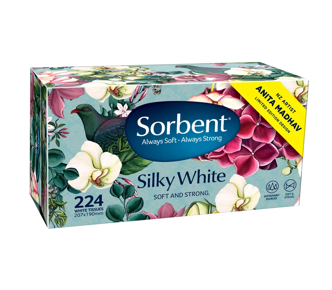 We were delighted when Kiwi artist Anita Madhav agreed to collaborate with us to create a unique packaging design for our Sorbent Silky White Limited Edition 2020 tissue collection. Anita is a full-time artist based in Auckland. She is inspired by NZ landscapes, modern design and colours. New Zealand's beautiful flora and fauna play a huge part in Anita's artwork. Purchase this limited edition design at all leading supermarkets while stocks last.