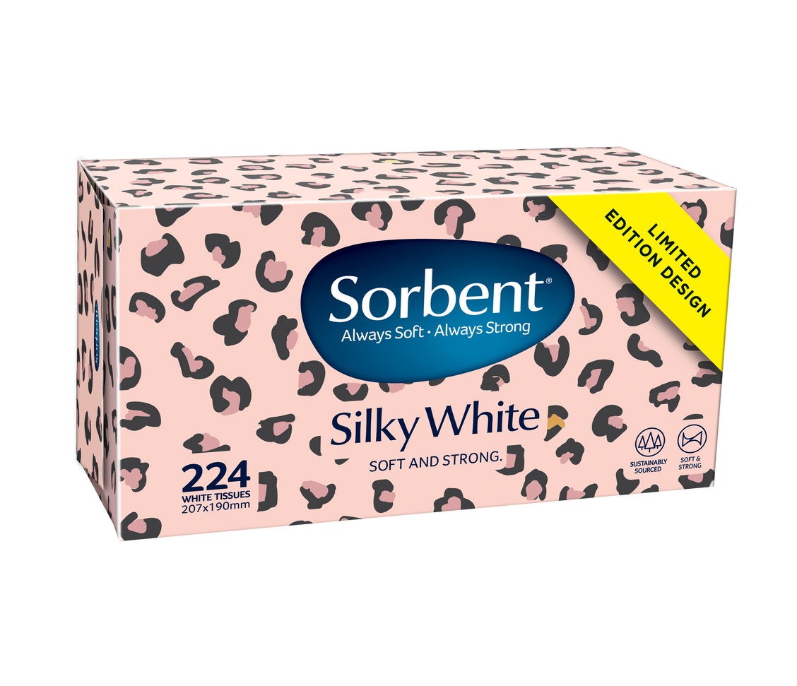 We took inspiration from the latest fashion trends to create this fun and funky animal print design. Use this tissues box to add a pop of colour around your home. This limited edition packaging design is available on Sorbent Silky White 224's tissues. Purchase now at all leading supermarkets while stocks last.