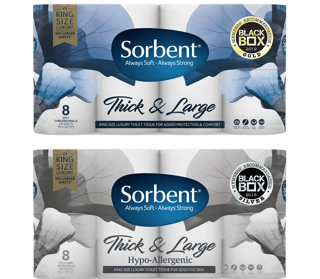 Due to it’s premium cues and luxury softness, the Sorbent Thick & Large toilet tissue collection was been included in two consecutive Premium Black Box campaigns. In 2018 our Hypo-allergenic variant was awarded Black Box Silver for it's absence of irritants and kingsize length meaning less sheets need to be used. The collection's first Black Box Gold was awarded the following year to Sorbent Thick & Large Silky White with a staggering 91% of samplers saying they would recommend this toilet tissue to others.